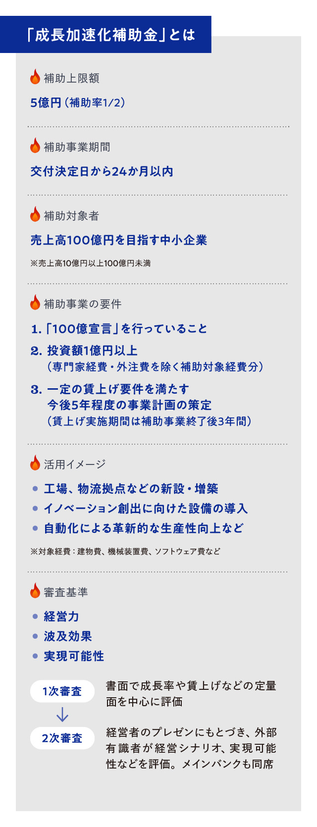 これは中小企業が売上高100億円達成を公に宣言し、採択されれば最大5億円(補助率1/2)の「成長加速化補助金」を活用できる制度だ。
